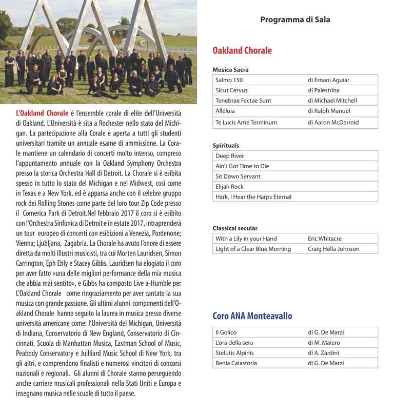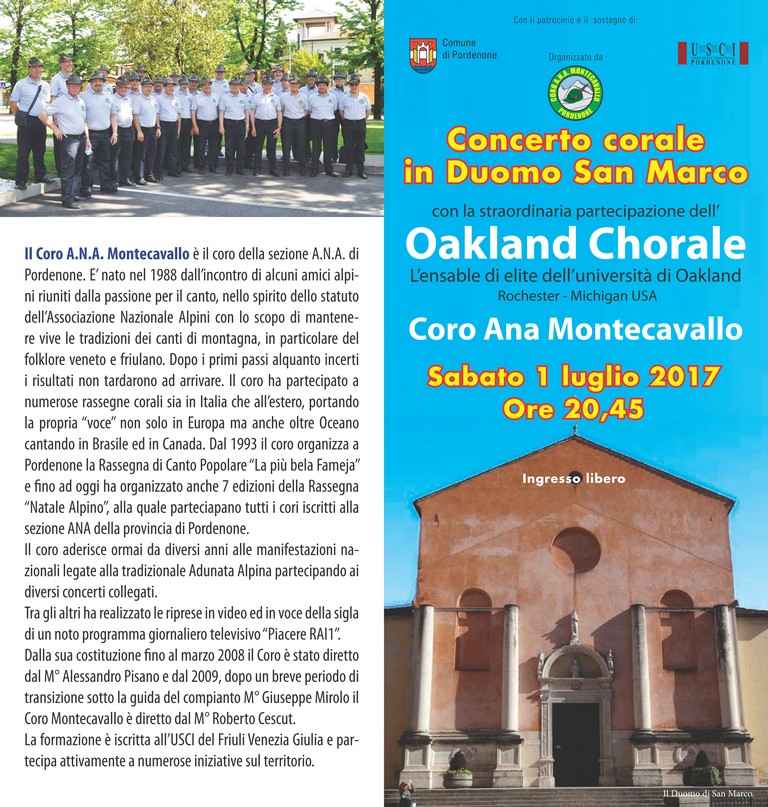 Concerto corale in Duomo San Marco con la straordinaria partecipazione dell’Oakland Chorale l’ensable di elite dell’università di Oakland. Organizzato da Coro A.N.A. Montecavallo Sabato 1 Luglio 2017 - Ore 20,45